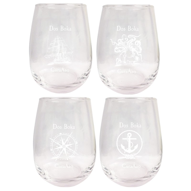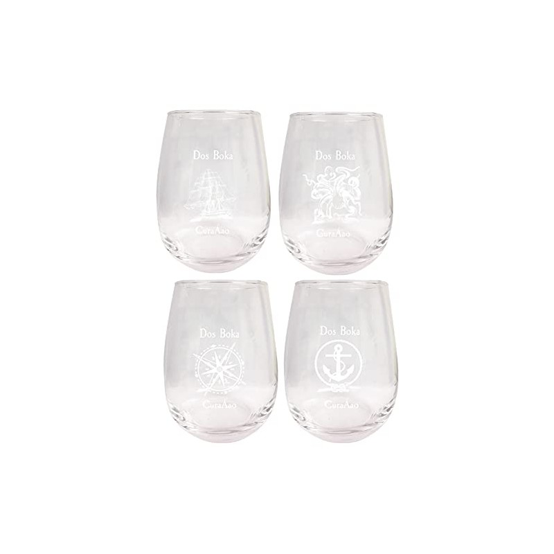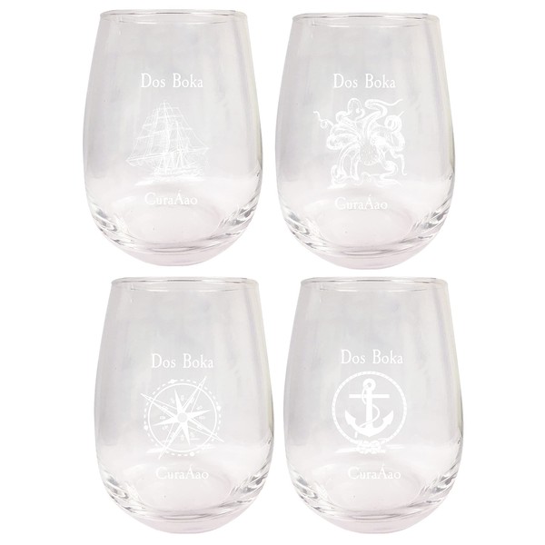 R and R Imports Dos Boka Curaçao Souvenir 9 Ounce Laser Engraved Stemless Wine Glass Nautical Designs 4-Pack