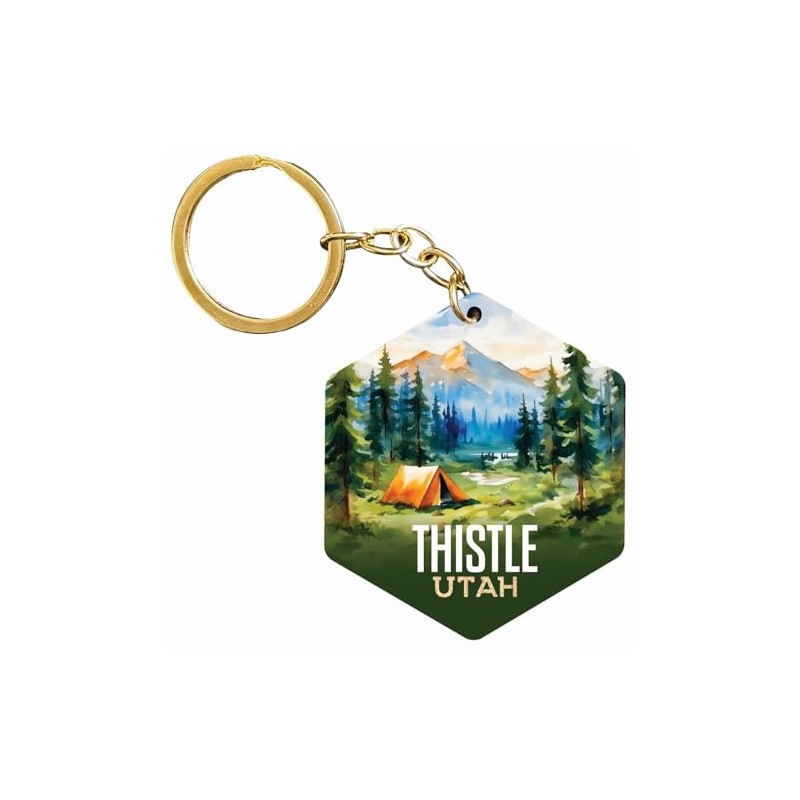 R and R Imports Thistle Utah Souvenir 2” Wooden Hexagon Keychain Watercolor Camping Tent Single
