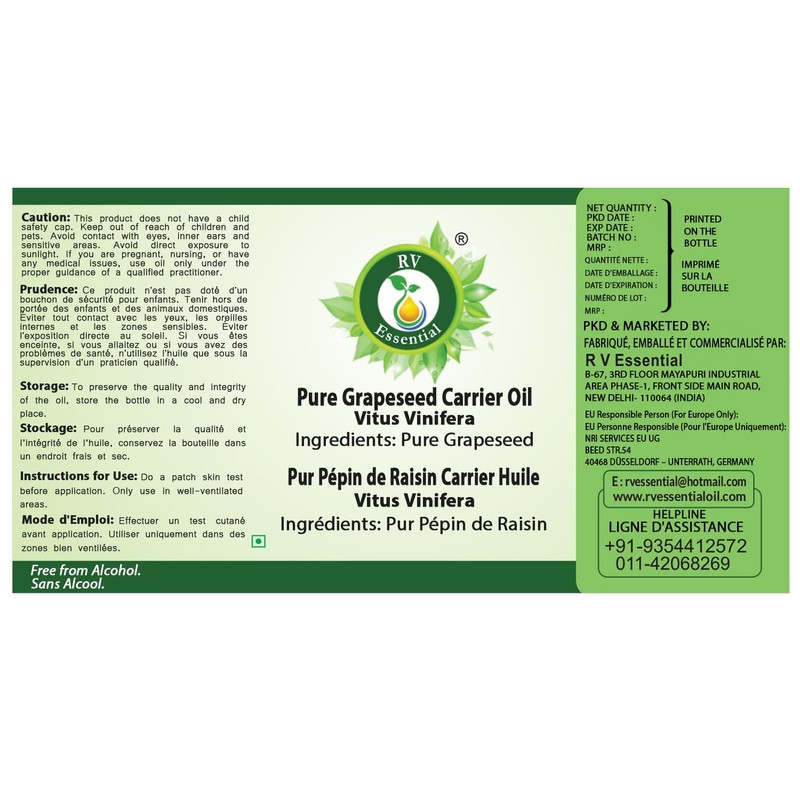 R V Essential Pure Grapeseed Carrier Oil- Vitus Vinifera (100% Pure and Natural Cold Pressed). Oils are packed in high quality amber glass bottles till 100ml. And 300ml, 630ml & 1250ml in high quality virgin aluminium bottles.