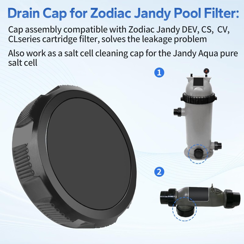- Drain Cap for Zodiac Jandy Pool Filter: R0523000 pool filter drain cap assembly compatible with Zodiac Jandy DEV series D.E filter models DEV48, DEV 60 and CS series cartridge filter models 100, 150, 200, 250. CV and CL series cartridge filter models 340, 460, 580. Pool drain cap solves your pool filter leakage problem