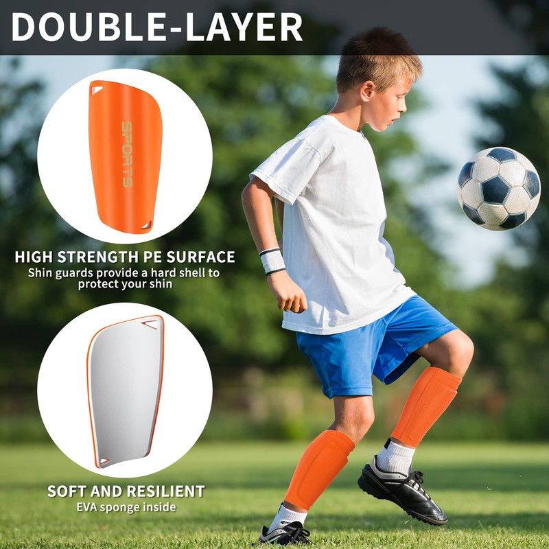 - ⚽【Comprehensive Protection】 The outer covering of the soccer shin guards is made of high strength PE hard shell, and there is a layer of EVA sponge inside. Soft and resilient. It can be used for comprehensive protection. 【M Size suitable for kids 5-13 Years Old】【L Size suitable for 13+ Years Old Teenagers and Adults】