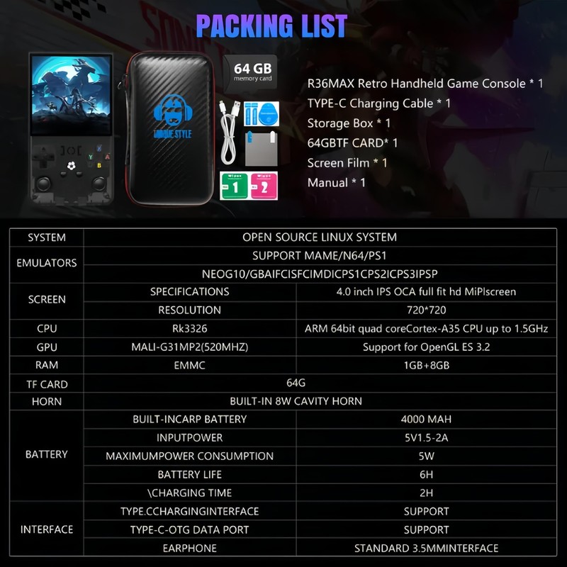 Games Storage: 64G built-in, plus TF card option, offers a 18000+ game library.