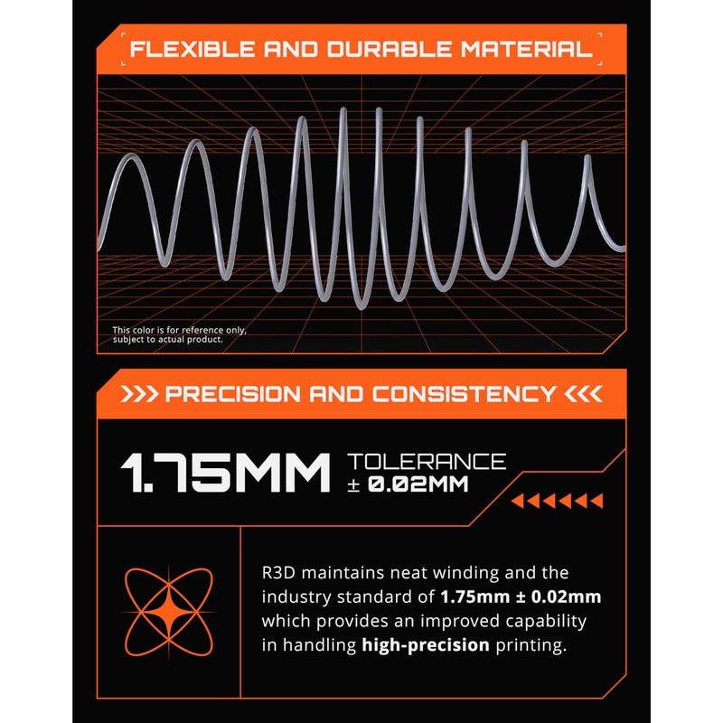 - 【PLA with Outstanding Blend of Impact Resilience and Stiffness】 – The R3D PLA filament is 1.6 times more rigid than other 1.75mm toughened PLA filaments.