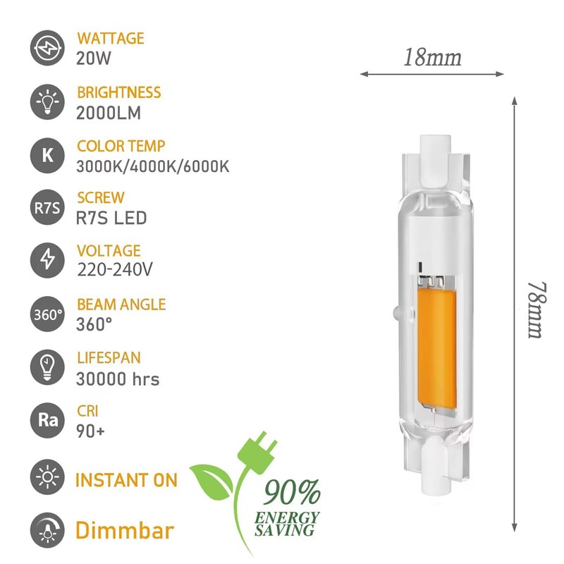 - Energy-saving up to 90%: R7S LED 78 mm dimmable bulbs only consume 20 W, the light output can perfectly replace 200 W halogen lamp directly, saving you 90% on electricity, technical improvement, same brightness and light output, lower energy consumption. R7S 78 mm low maintenance costs, low maintenance costs and less frequent lamp changes. With a service life of up to 30,000 hours.