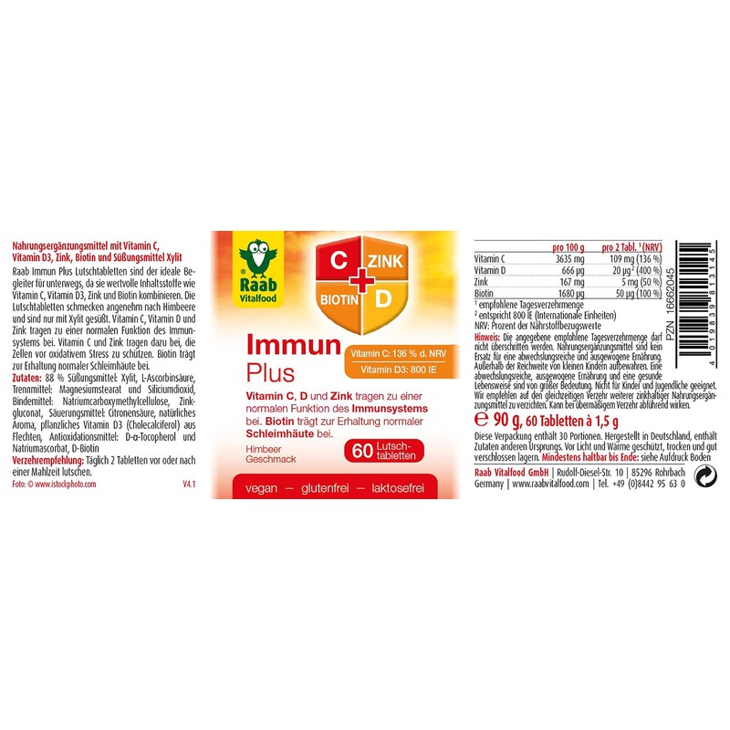 Raab Vitalfood Immun Plus Lozenges, Vitamin C, Vitamin D3, Zinc and Biotin, Pack of 60