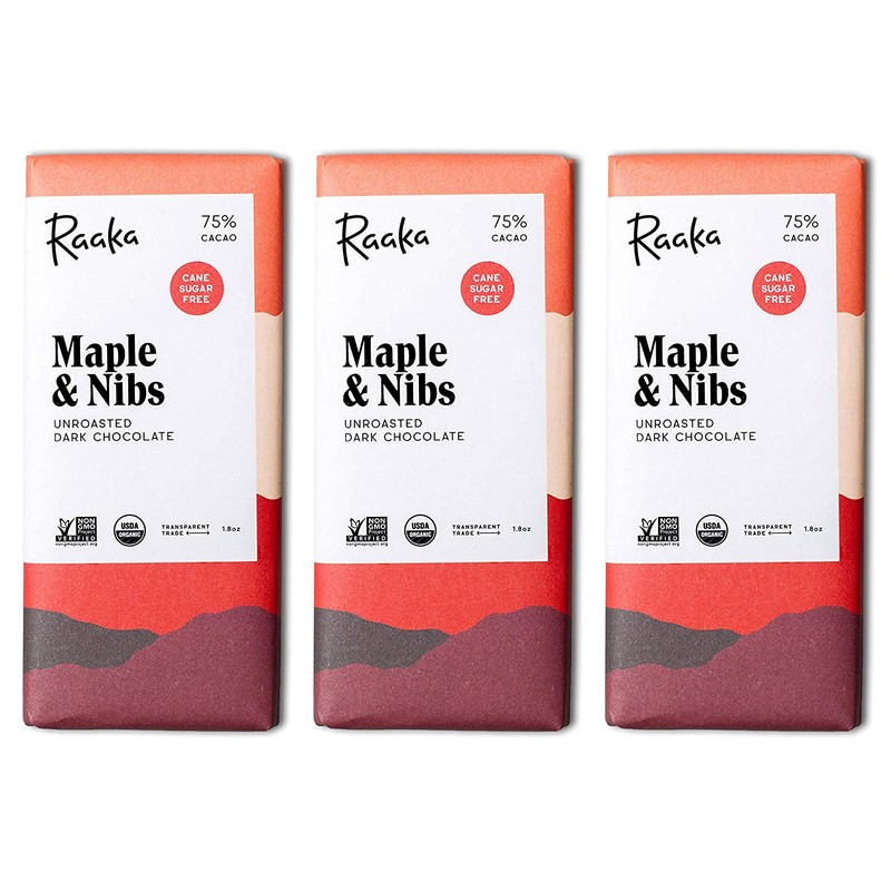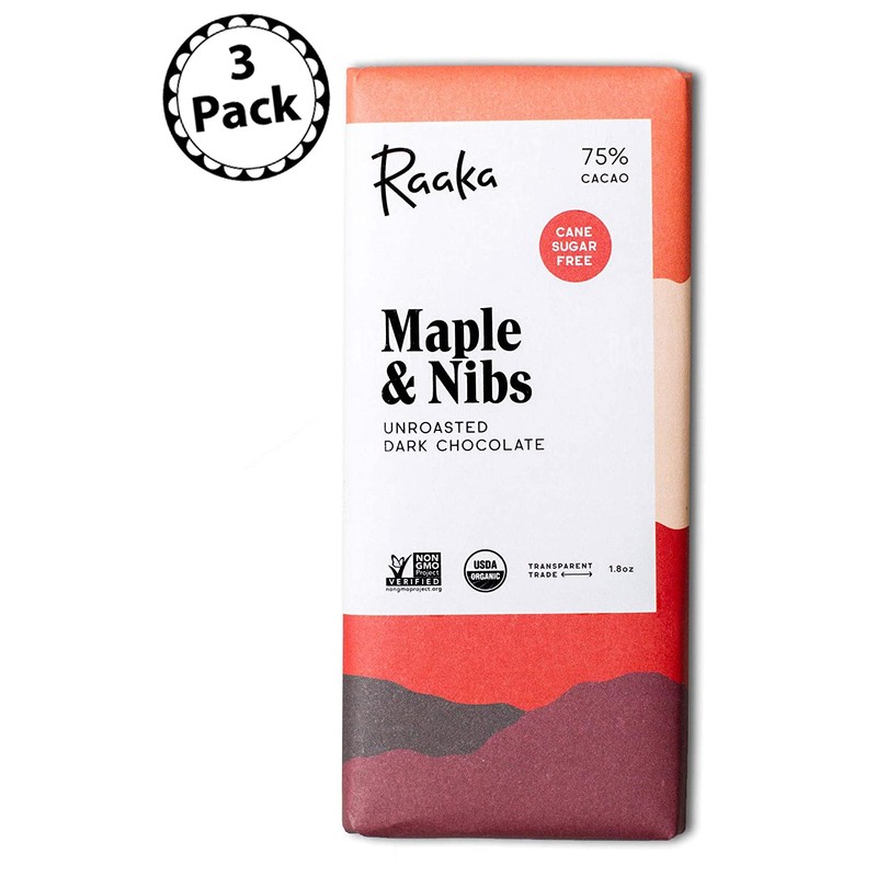 - Raaka Chocolate Maple & Nibs Dark Chocolate 75% Cacao (1.8oz Bar - 3 Pack). Craft chocolate made from bean-to-bar in Brooklyn, New York.