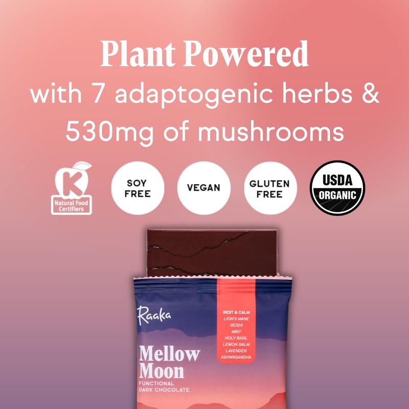 Raaka Functional Mushroom Chocolate | Mellow Moon - Rest & Calm | 64% Cacao Dark Chocolate, Lion's Mane, Reishi, Ashwagandha | Vegan, Organic, Gluten-Free | 10 Adaptogen Chocolate Bars