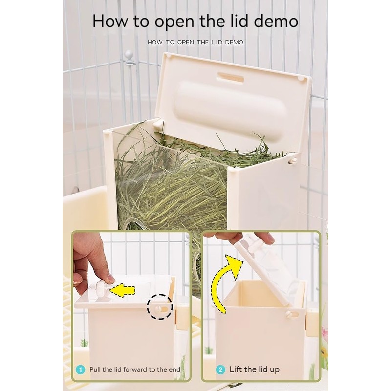 - Easy to fill hay :The top of the rack has a lid that can be opened for adding hay . The lid also keeps the hay from being damaged and prevents small animals from getting injured by jumping into the hay feeder.The lid is locked to prevent pets from opening it