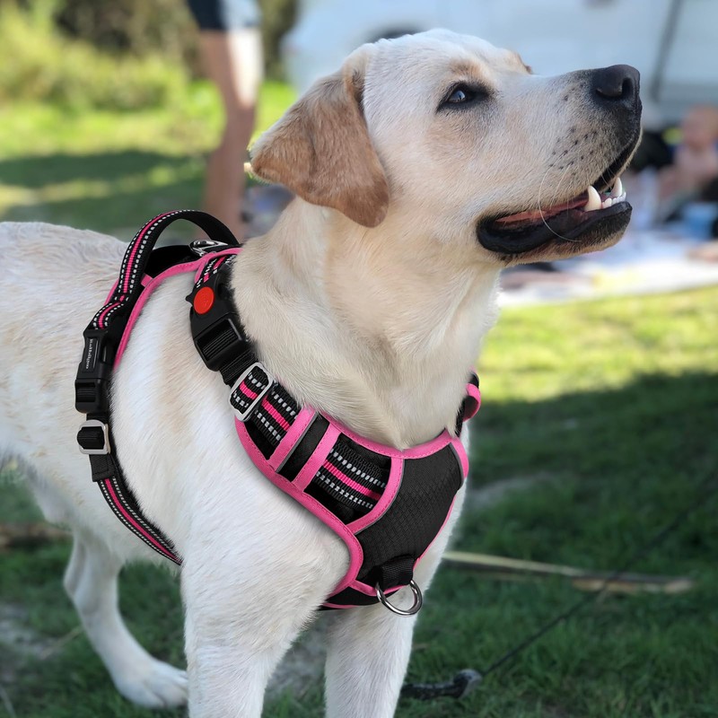 rabbitgoo Dog Harness for Large Dogs, No Pull Pet Vest with 3 Buckles, Adjustable Soft Padded Pet Harness with Easy Control Handle and Reflective Strips, Black & Rose Pink, L