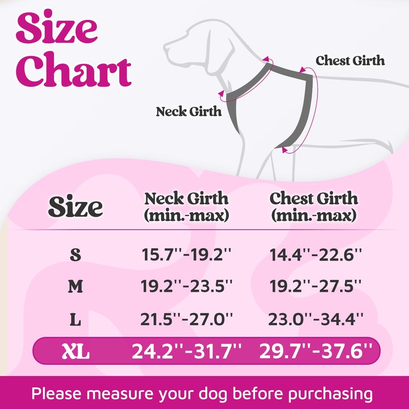 • Complete Adjustability: There are 4 adjustable sliders with flexible straps, so you can adjust the sliders to create an ultra-tailored fit for your puppy. Size information: 24.2"- 31.7"(Neck Girth), 29.7"- 37.6"(Chest Girth)