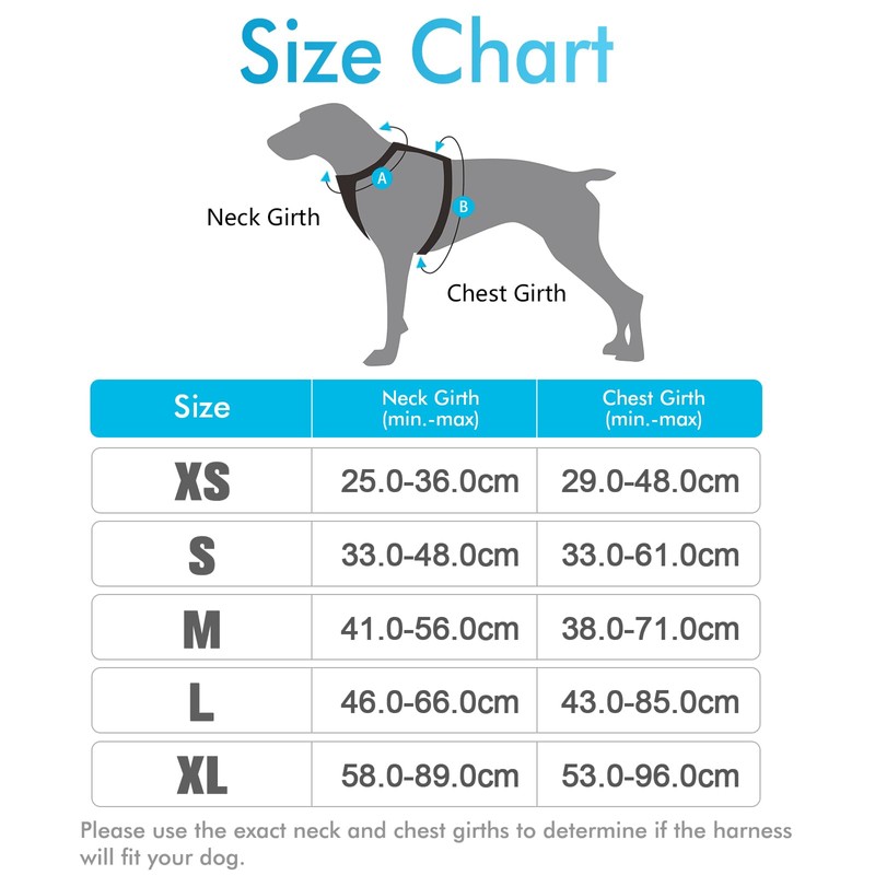- Extra Large Dog Harness: Measuring neck girth: 58 - 89 cm, chest girth 53 - 96 cm. Recommended breeds: Medium to large dogs, such as golden retriever, huskie, labrador, alaska, german shepherd, akita, etc. make your puppy stand out with this wonderful harness