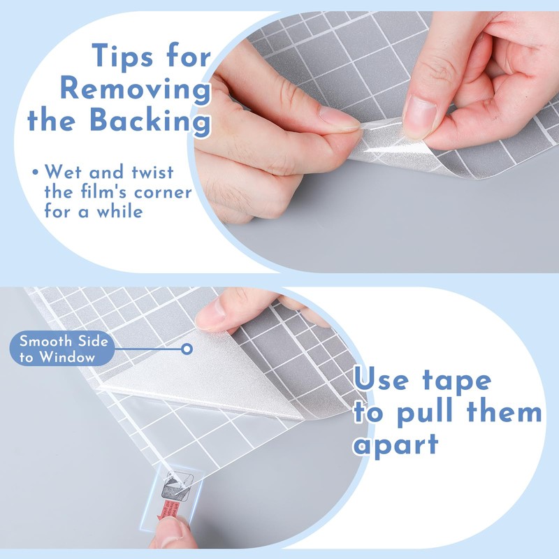- Tips for Installation: Make sure you have already removed the backing film before applying. It is also important to thoroughly clean the window surface, edges and corners without any dust. Remember to spray plenty of water on both the window surface and the back of the film. The more water, the better