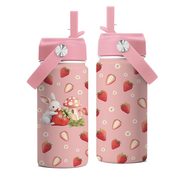 Rabbits and Strawberries Water Bottle, 16 oz Water Bottles with Straw Lid, Stainless Steel Insulated Tumbler, Cute Bunny Cup Gifts for Birthday Christmas