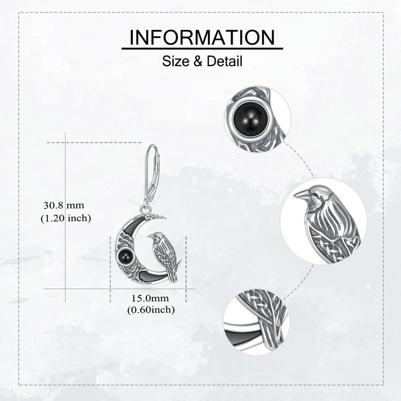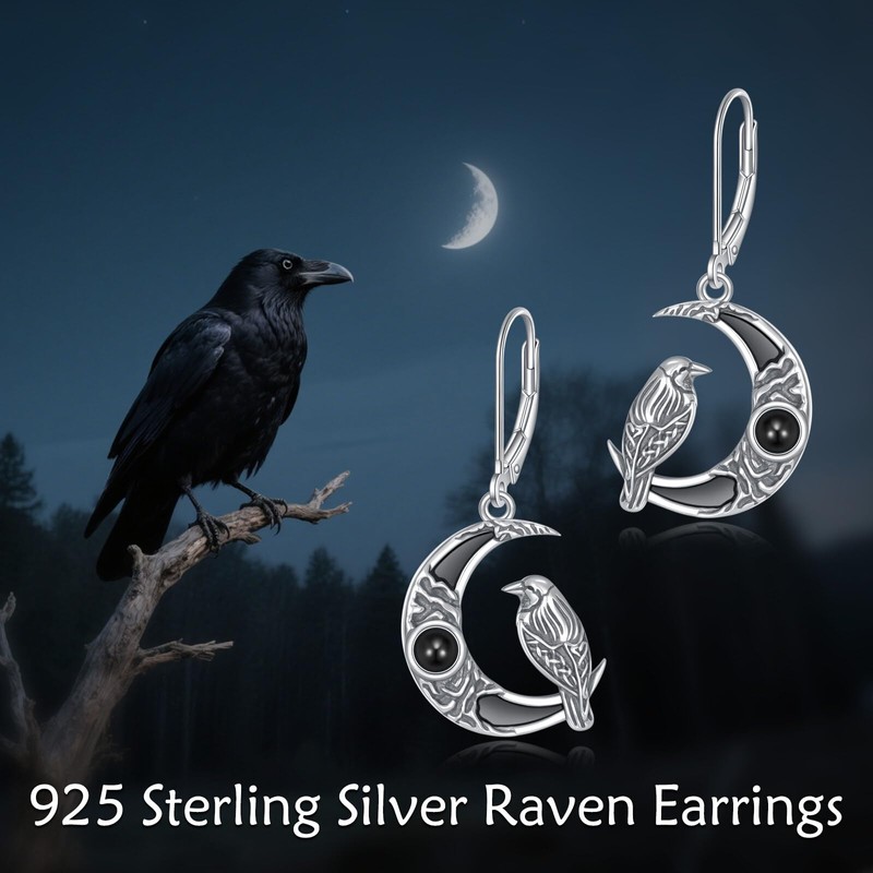 Raben-Ohrringe aus 925er Sterlingsilber mit schwarzem Onyx, Mond- und Krähen-Anhänger, Raben-Schmuck, Geschenke für Frauen, Ehefrauen, Mütter