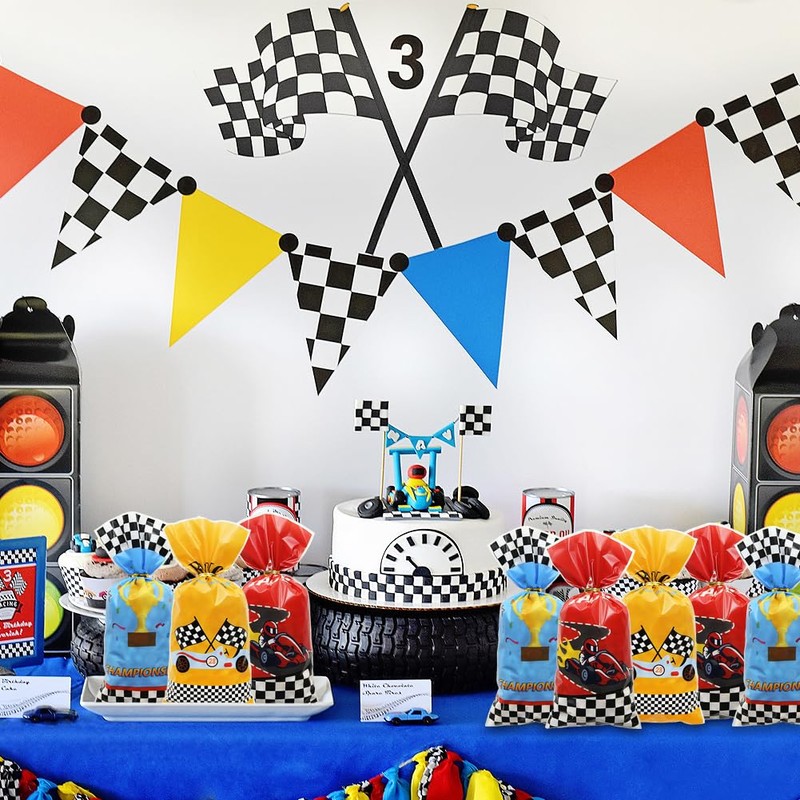 - 🏁【Race Car Party Favors】: Racing theme in 3 designs, bright colors in blue, yellow and red. Features a championship cup, #28 car, black and white checkered flag, and a racer racing on a track. A fun addition to your Birthday party, easily turn your Birthday party to Race Car style.