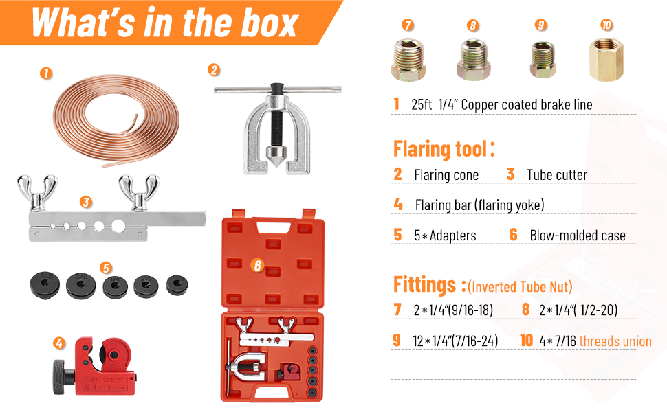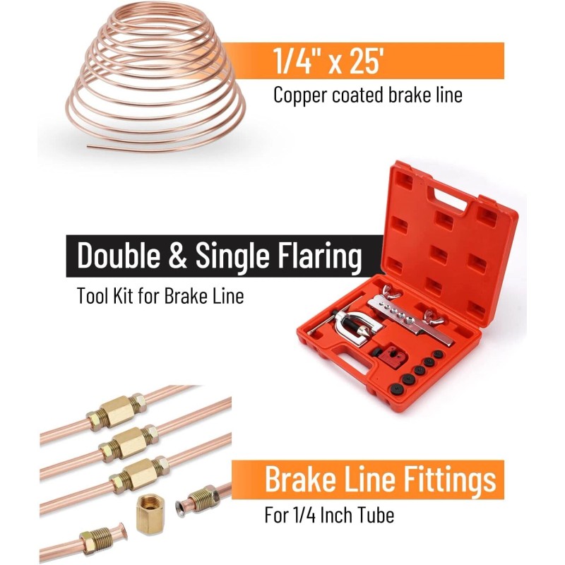 Racewill Brake Line Kit 25 ft 1/4 Copper Pipe Double & Single Flaring Tool w/ 20 Fittings