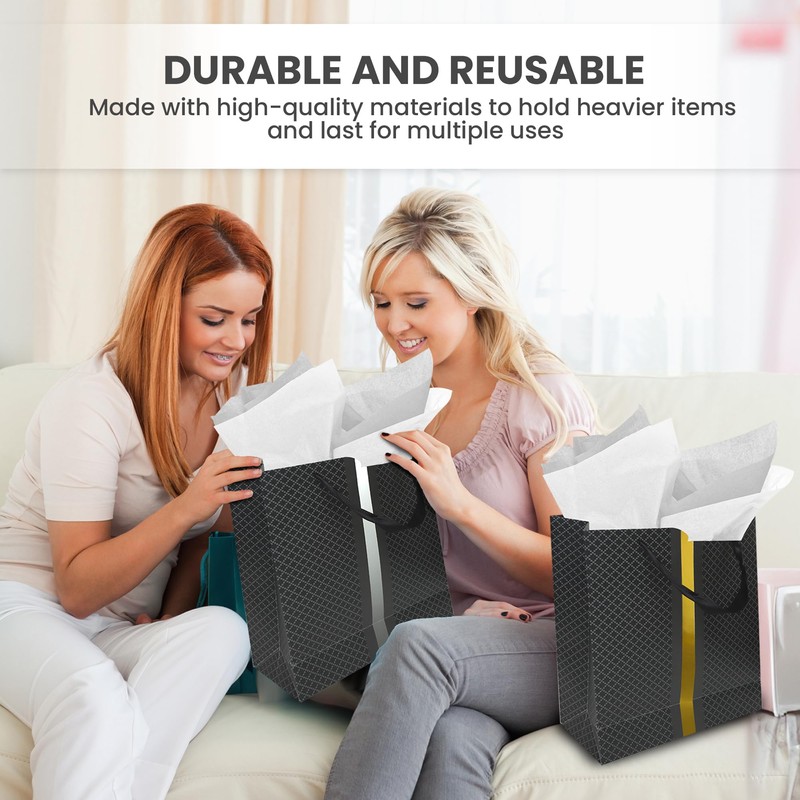 RACHELLE'S Elegant & Classy Paper Gift Bag Assortment with Tissue Paper – Premium Quality & Sturdy Large Bags Great for Birthdays, Christmas & More (Black Bag with Gold/Silver Stripe Design – 8 Pack)