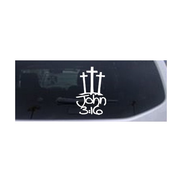 White 10in X 6.3in -- 3 Crosses With John 3:16 Christian Car Window Wall Laptop Decal Sticker When making your color choice please be aware that our decals do not have a background or background color at all. These are decals not stickers. . When applied all you will see is the outline as shown in the images. If the decal will be going on glass you will want to use a bright color like white, yellow or pink. Black and other dark colors will not show up well on glass. Our decals are die cut from solid 2.8mil vinyl. The vinyl is rated at 5yrs outdoors. Our decals can withstand cold, hot and wet weather with no problem. If you are using the decal inside they will pretty much last as long as you want them. The decals can be removed from any surface but cannot be reused once removed. If applied to a painted surface such as a wall or auto body the paint may come off with the decal when removing it. Our decals can be applied to any smooth flat surface including car, truck, van and suv windows. Our decals can also be used on the body or hoods of automobiles like sports cars, race cars and trucks. You can even use our decals on your motor home or camper. Our decals can also be used for wall art. You can apply any of our decals to the walls in your home, office or garage to add whimsical art. You can also use our decals to personalize your laptop or books. Our decals make great laptop skins. Other places you could use our decals include - horse trailers, kayaks, boats, vans, motorcycles, ATVs, snowboards, snowmobiles, surfboards, RVs, helmets, glass doors, gun cabinets, mirrors, walls, mailboxes, picture frames, tool boxes, painted wood, aluminum, plastics, fiberglass etc...
