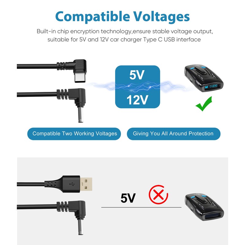 - 【Stable Working Performance】The radar detector cable adopts a new chip encryption technology.When the cable is connected to the C-type car charger, it can supply power to the radar detector, supporting PPS/PD3.0/PD2.0/AFC/FCP/SCP/PE2.0/PE1.1/SFCP