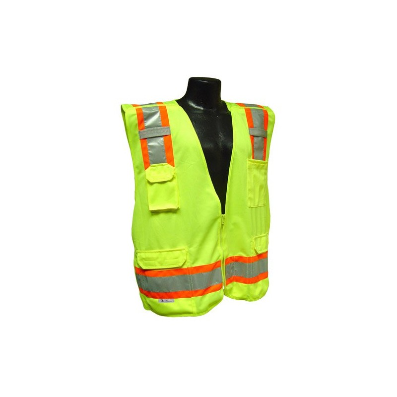 Radians Class 2, Breakaway Survey Safety Vest has a breakaway zipper, 5 point breakaway mesh, 1 Lower exterior pocket, 1 upper and 1 lower interior pocket. This vest is made of lightweight, highly visible polyester mesh that maintains brightness after 25 washings. This vest also has a 2" Reflective stripe on front and back for increased visibility or night work, meets the ANSI/ISEA requirements, and comes in Two Tone Orange or Green.