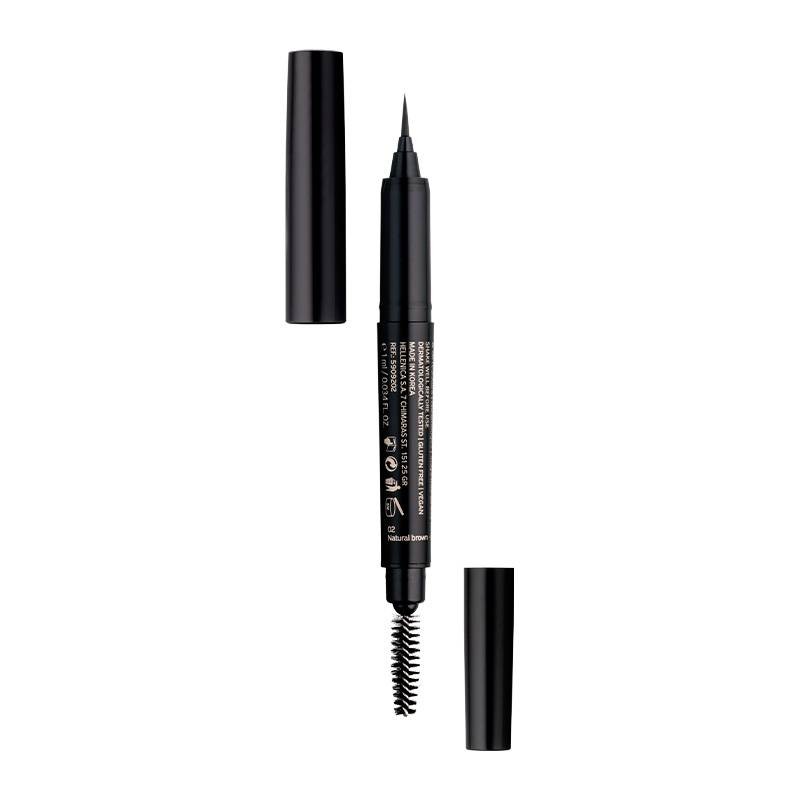 Τέλειο σχήμα και χρώμα με πολύ σταθερό tattoo αποτέλεσμα για φυσικά φρύδια! Ο υγρός μαρκαδόρος με την λεπτή, εύκαμπτη μύτη και το κωνικό σχήμα εφαρμόζει το χρώμα με ακρίβεια για τον λεπτομερή σχεδιασμό του περιγράμματος, την συμπλήρωση, το γέμισμα, αλλά και τον χρωματισμό των φρυδιών, ακόμα και των λευκών ενώ το χρώμα παραμένει σταθερό όλη την ημέρα χωρίς να απλώνει, να μουτζουρώνει ή να ξεθωριάζει. Η άλλη πλευρά με το απαλό βουρτσάκι διαμορφώνει τα φρύδια και ενδείκνυται και για blending.