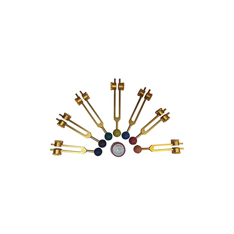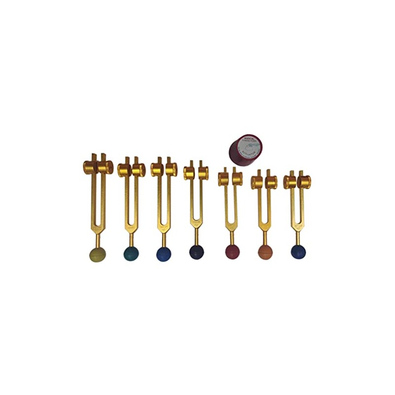 Radical Golden Chakra Weighted Set of 7 Colored Premium Tuning Forks w Chakra Colored Balls - Long Handles with Mallet and Velvet Storing Pouch