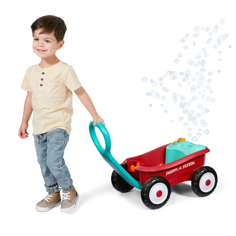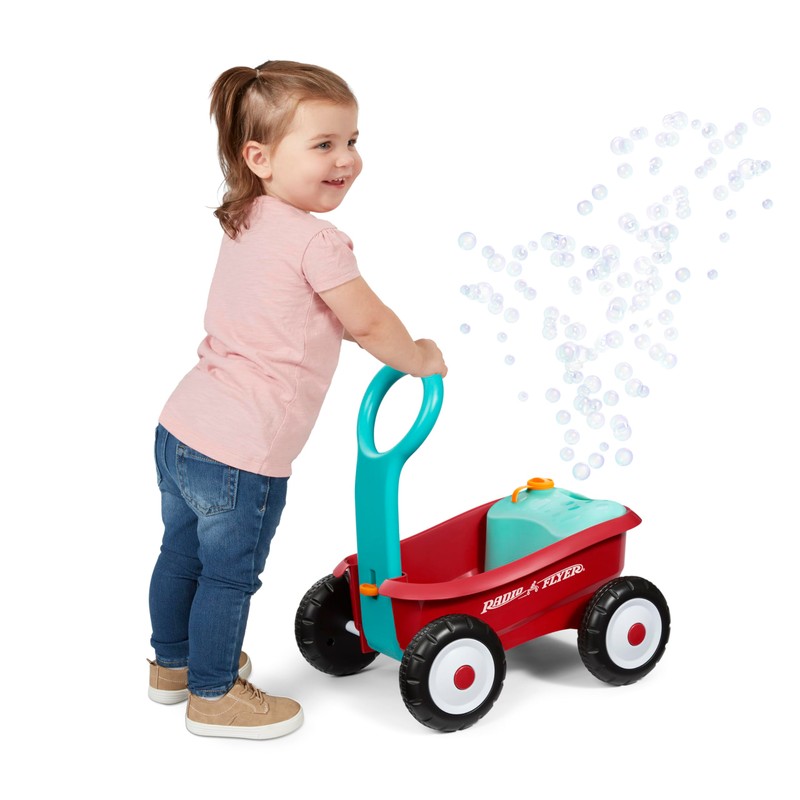 - BLOWS BUBBLES WHEN MOVED: Our bubbles are kid-powered – no batteries required! Bubbles will blow as the back wheels move, whether the wagon is pushed or pulled.