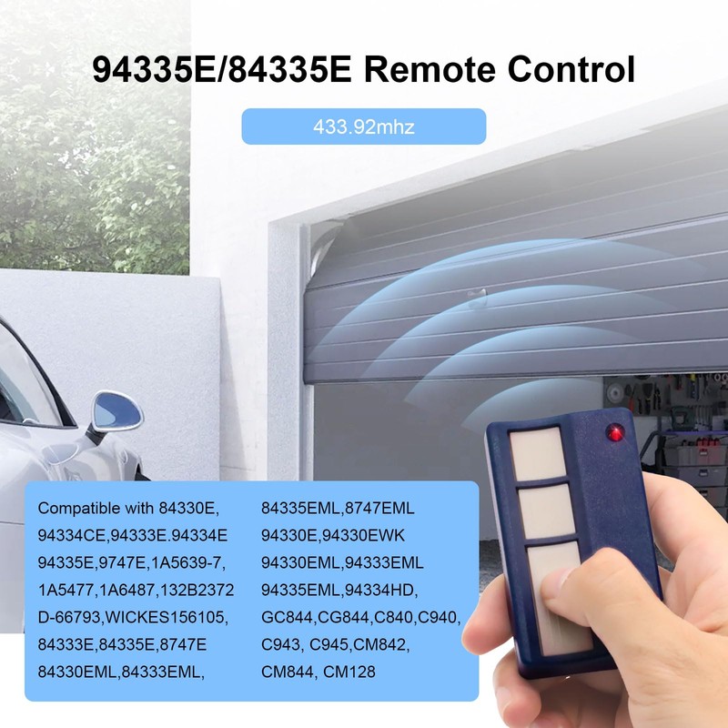 - Replacement for garage remote control: operation at 433.92 MHz, our hand-held transmitter for garages is a great replacement for Chamberlain / LiftMaster / MotorLift remote control models with "84" and "94" at the beginning, including but not limited to 84330E, 84330EML, 84333E, 8433E. 333EML, 84335E, 84335EML, 94330E, 94330EML, 94333E, 94333EML, 94335E, 94335EML