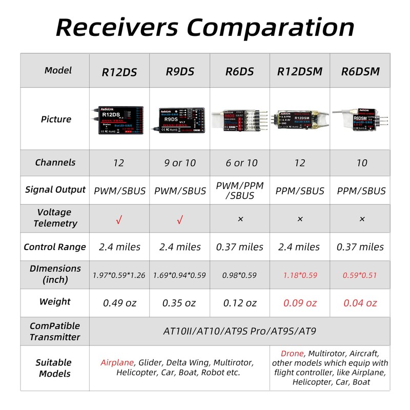 - 9/10 Channels: Support PWM/SBUS signal output, works with Radiolink AT9/AT9S/AT9S Pro/AT10/AT10II. Please make sure SYSTEM channel selection is 10ch mode when it works with AT10II 12 channels transmitter, or it won't workwell.