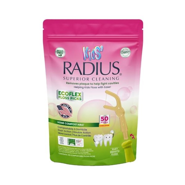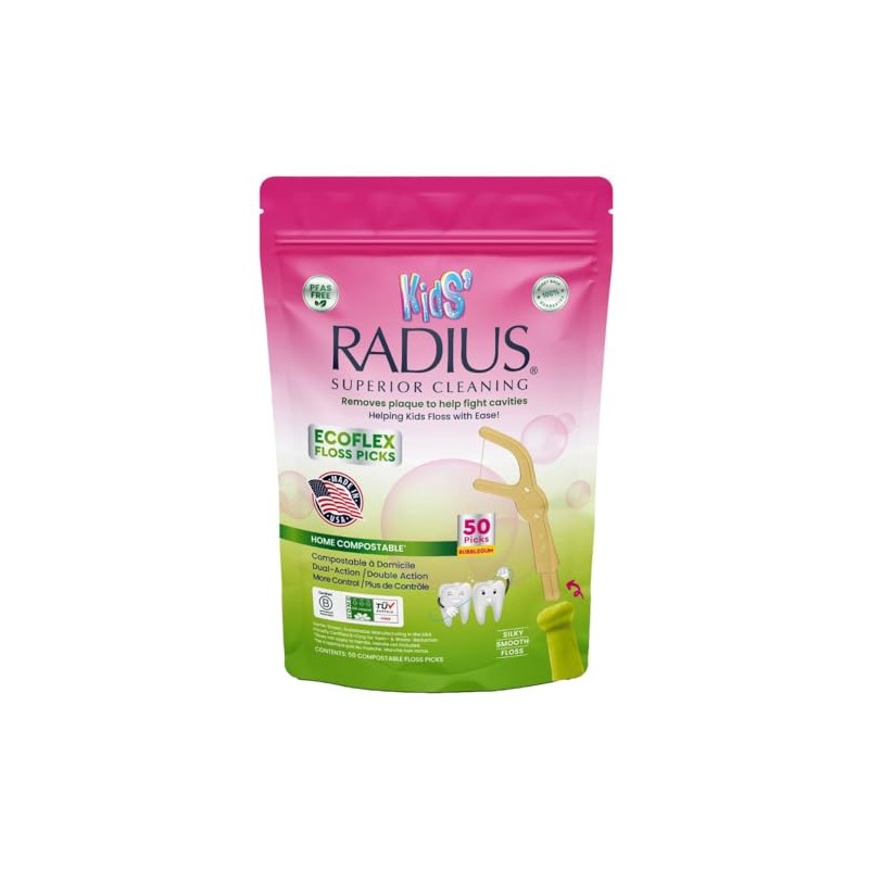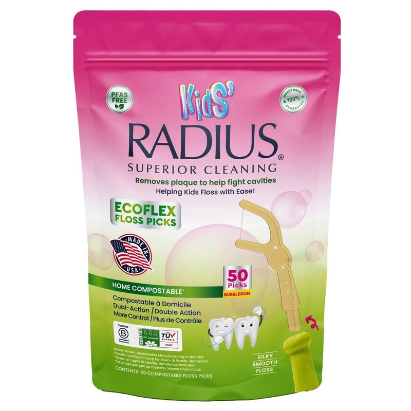 Radius Bubblegum EcoFlex Compostable Floss Picks Kids for Oral Care Boost Non Toxic Tooth & Gum Protection (50 Single Use Dual Action Flossers per Pack)