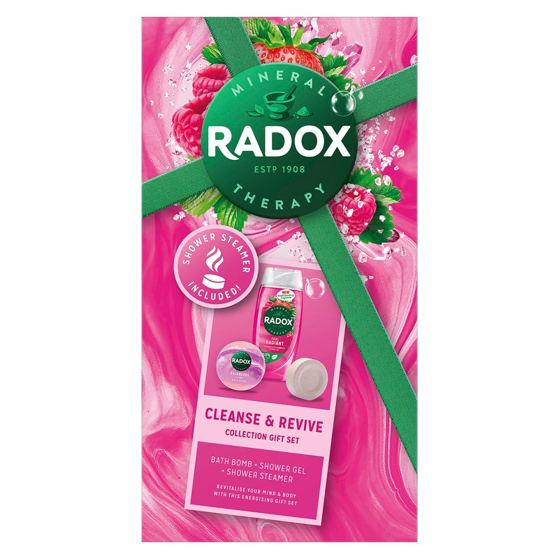 - RADOX Cleanse & Revive Collection Gift Set features our Feel Radiant Shower Gel, either our Raspberry or Blueberry Reviving Bath Bomb, and a RADOX Shower Steamer for the perfect gift for her