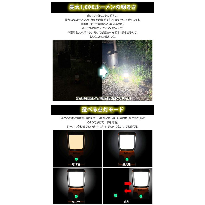 - 最大1,000ルーメンの明るさ:最大の特徴は、その明るさ。最大1,000ルーメンという圧倒的な明るさで、360°全体を照らします。暗闇も、まるで昼間のような明るさに。キャンプの時のメインランタンとして、停電時も、このランタンだけで部屋全体を明るく照らせるので、もしもの時の備えにも。
