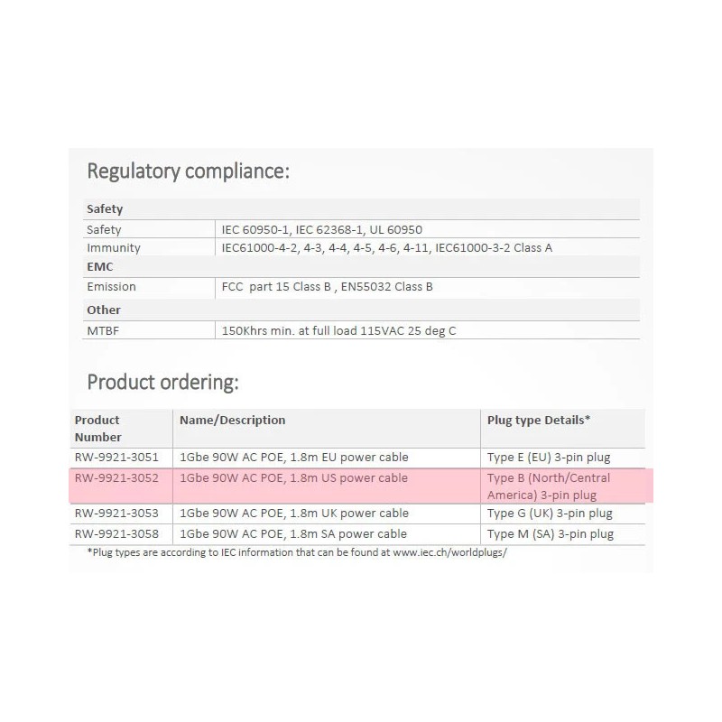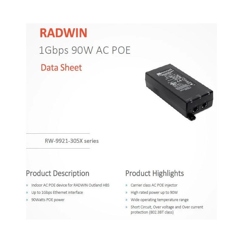 RADWIN New RW-9921-3052 AC to DC GigE PoE Injector, 802.3bt 90W 56VDC, US cord