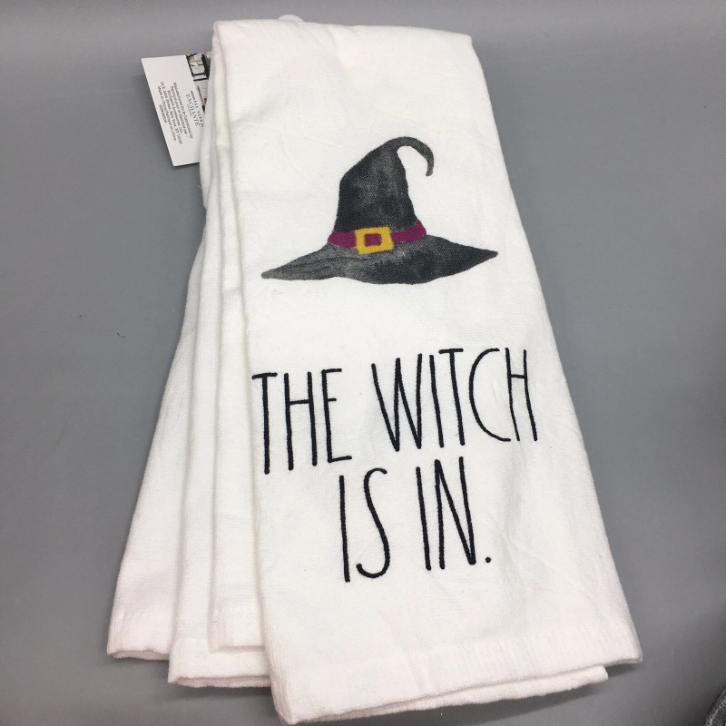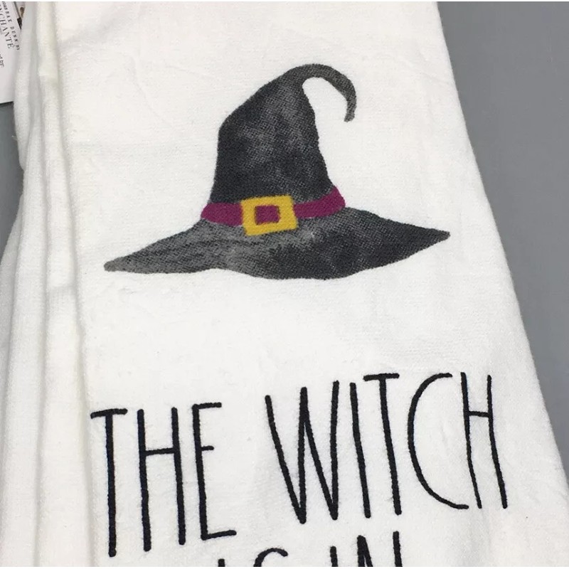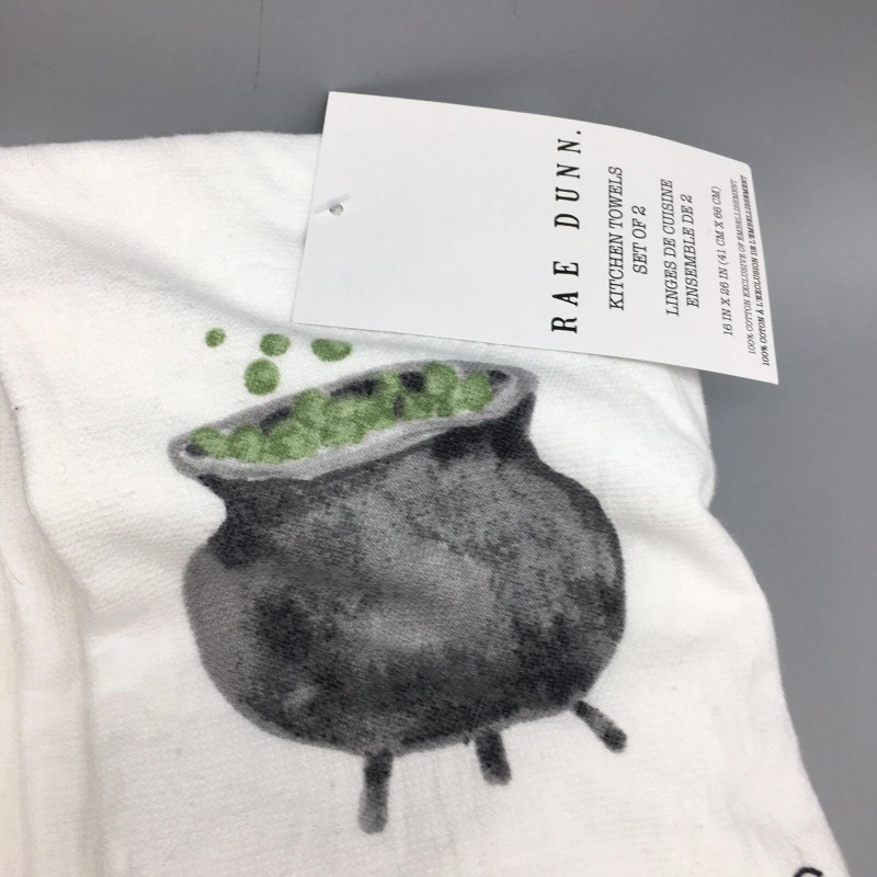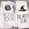 Rae Dunn 2pc Rae Dunn Halloween HOCUS POCUS WITCH IS IN Kitchen Towel Set Hat Cauldron