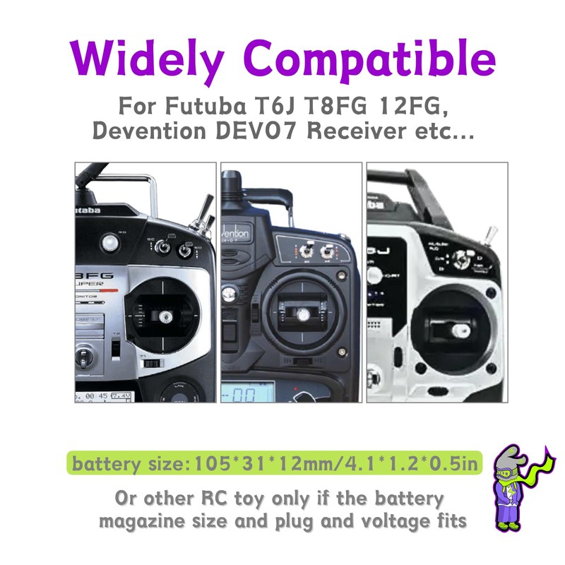 - Wide Application: Raebatuol 7.4V 2200mAh 8C Lipo rechargeable batteries compatible for Futuba T6J T8FG 12FG,Devention DEVO7 Receiver/Transmitter etc. (Or any other equitment only if the voltage, dimension and the plug match, then it will fit). Please kindly check the battery compartment size and the original battery plug of your toy
