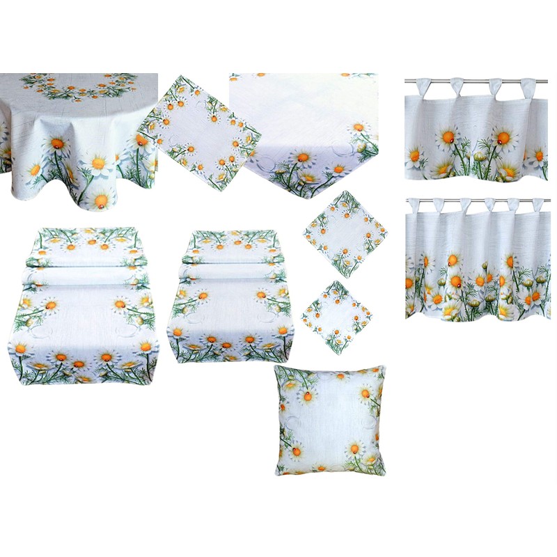 - Chamomile flowers and ladybirds on white wooden plank look, base colour white/light grey patterned, flowers and beetles white, orange, red