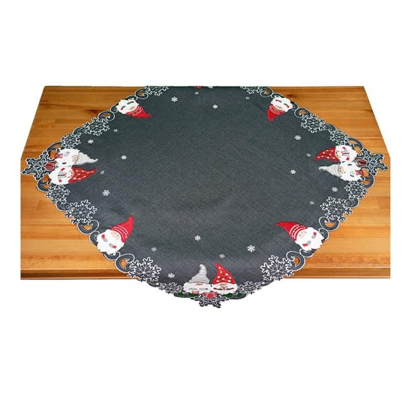 - Fabric made from 100% polyester in easy-care quality. Fashionable design and classic look. The base tone is white. Embroidered with cute gnome men in white/red. The edge is wavy, decorated with white snow stars. Incorporated glitter in grey and red. A modern winter decoration for young and old.