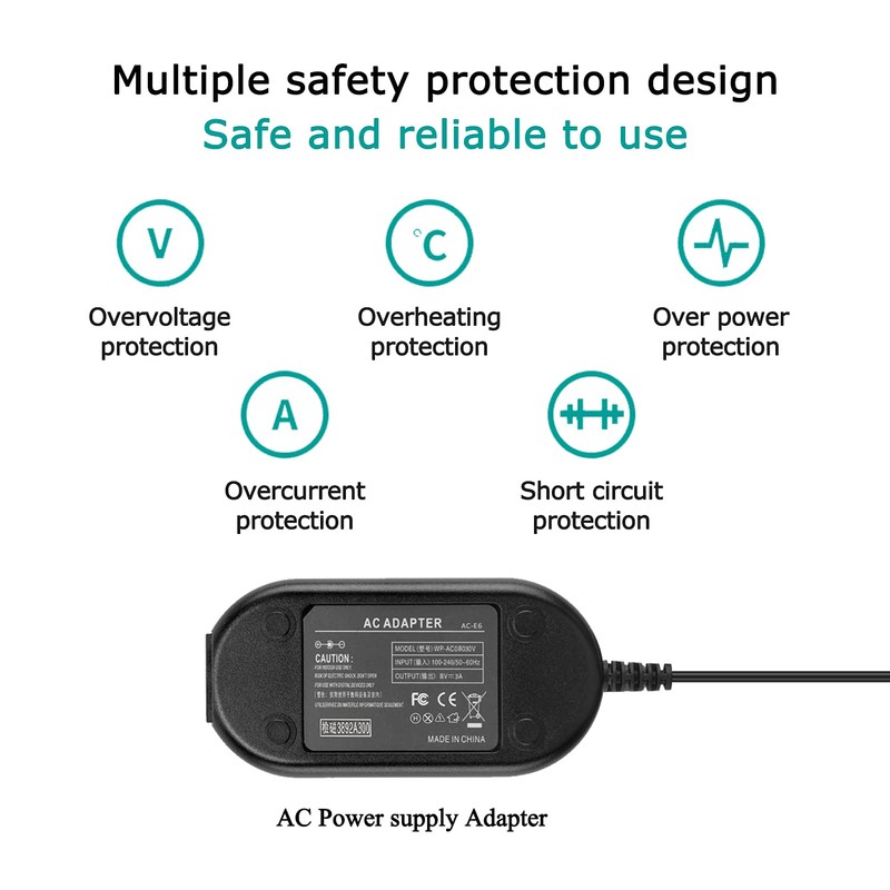 • ★SATETY PROTECTION:This adapter kit compact and lightweight can continuously power the camera. use ABS flame retardant material.Already available FCC, CE, ROHS etc Certification. Buit-in smart chip against Over-Heated/Over-Current/Over-Voltage/Short-Circuit protection.