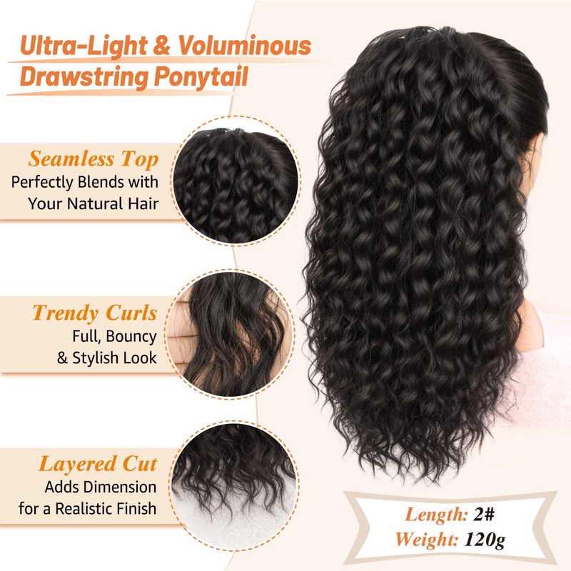1. Natural, Fluffy & Lightweight. This long curly drawstring ponytail is crafted with a multi-layered design, making it lightweight yet voluminous. It instantly enhances your hairstyle with a full and bouncy look.
