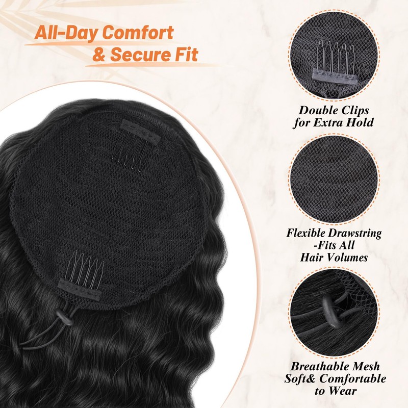 - Easy to Wear & Secure Fit – Stay Confident All Day The clip-in & drawstring design allows for quick and secure attachment. Simply tie your hair into a bun, clip in the ponytail, and pull the drawstring for a perfect fit. Featuring two strong combs and a breathable mesh cap, this ponytail stays secure and comfortable all day long without slipping.