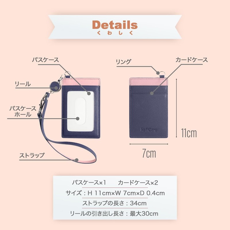 - Size (W x H x D): 2.8 x 4.3 x 0.1 inches (7 x 11 x 0.4 cm); Weight: 2.5 oz (70 g); Material: Cowhide leather; Pass case x 1, Card case x 2, Strap with reel x 1 (Strap length: 13.4 inches (34 cm), Reel length: 11.8 inches (30 cm)