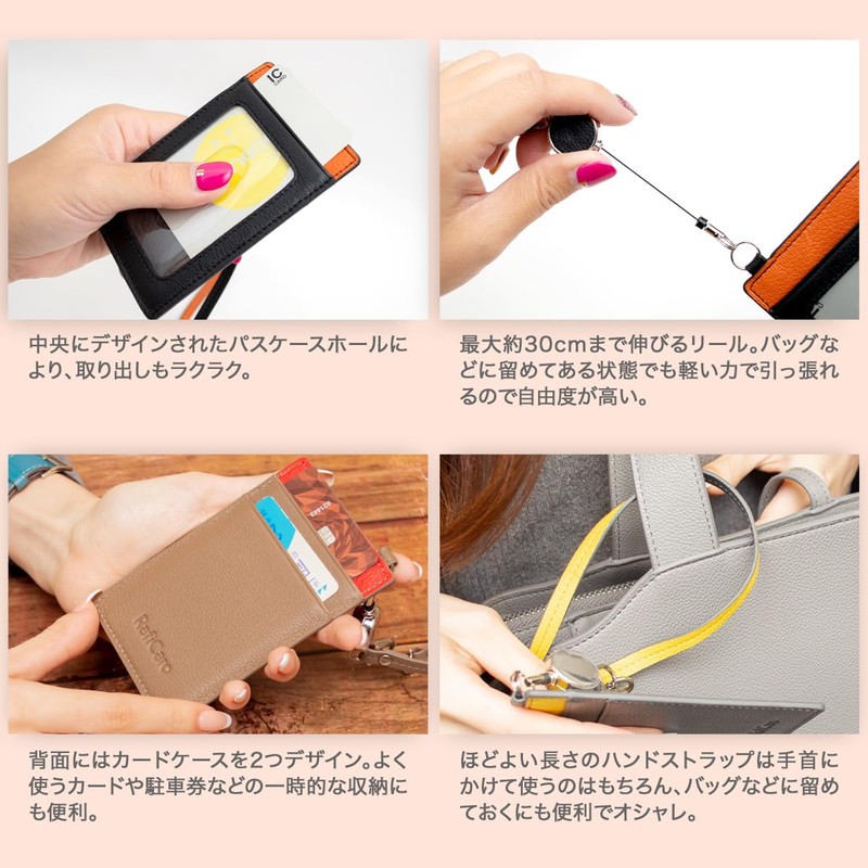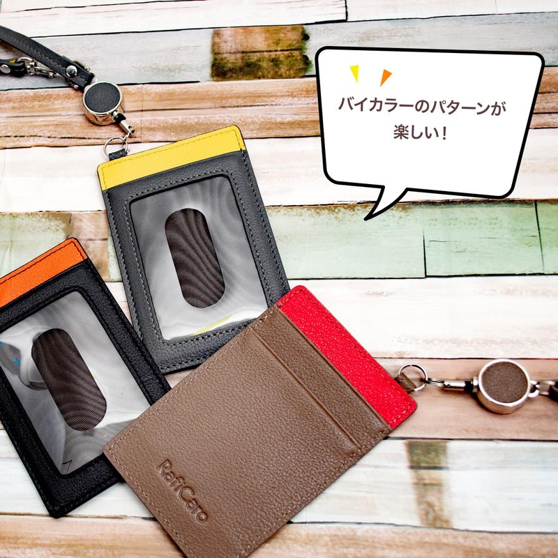 RafiCaro Women's Pass Case with Reel, Cowhide Leather, Commuter Pass Case, Employee ID Case, Bicolor IC Card, 1 Card Pocket, 2 Card Pockets, Leather, blackorange