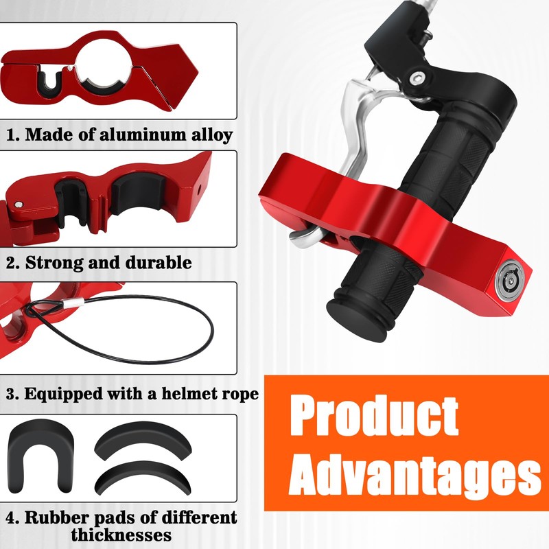 - 【High-quality Material】The motorcycle handlebar lock is made of high-quality aluminum alloy material, which is rust-proof, waterproof, sturdy and durable. The red color on the surface of the motorbike brake lock is not easy to fade, which is very simple and stylish.