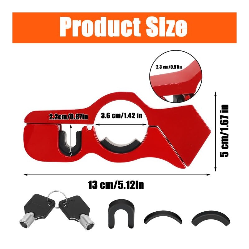 Dimensions: The lock is 13 cm/5.12 inches long, 2.3 cm/0.91 inches wide, 5 cm/1.67 inches high, and the motorcycle handlebar lock diameter is 3.6 cm/1.42 inches