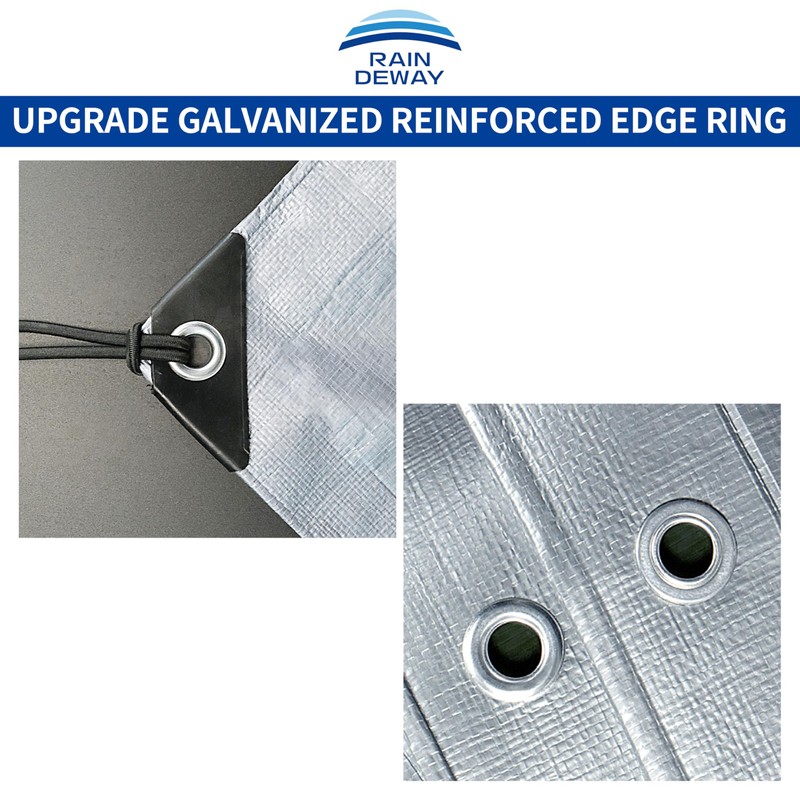 About RAINDEWAY Tarp: RAINDEWAY tarp is made of tightly-woven polyethylene fibers; 10Mil Thickness Heavy Duty tarp , 5.9 oz / sq yard; Metal grommets around the edges for better durability; Silver / Brown two color design, Can be used on both sides; High quality polyethylene tarp & waterproof. Good For What You Need It For: To cover your backyard pool; To cover the patio furniture; To be a ground cloth for tent or Easy to tarp up your tent; Slip and slide kickball; Keeping dirt out of the back of your truck; Providing a surface for your implements or plants; Cover your pet cages on cold evenings or rain day; Wrap your wooden side by grommets (holes) to be up to tie down or to insert bungee wrap; Dump truck tarp , Leaf tarp , etc.