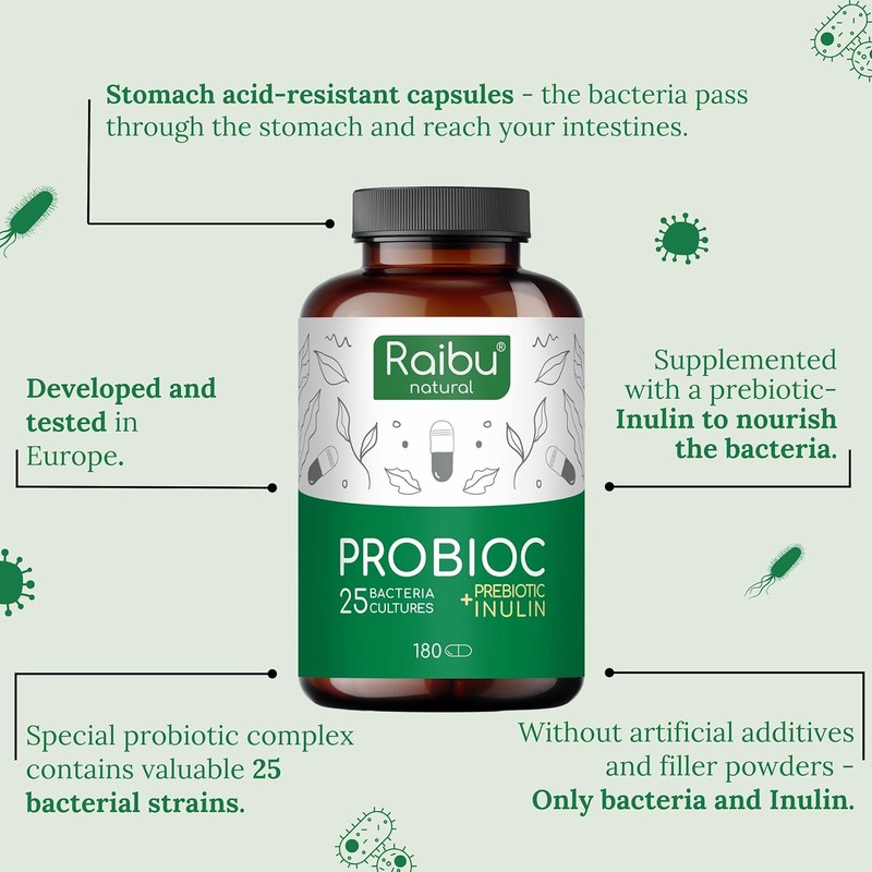 Raibu Probiotics for Gut Health - Probiotics & Prebiotics - 25 Bacterial Cultures - 180 Enteric Coated Capsules - 60 Billion CFU - Lactobacillus Acidophilus & Bifidobacterium - No additives & Vegan