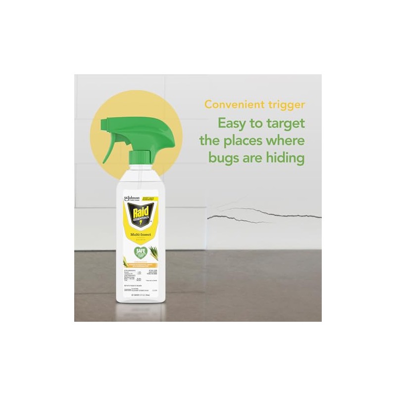 Raid Essentials is made with essential oils, and is specifically designed with plant-based ingredients to attack bugs. Now you don't have to choose between being safe (when used as directed) and effective when selecting products to protect your home from bugs. Safe for use around children & pets, when used as directed. Kills Insects: Roaches (such as German Roaches and American Roaches), Ants (such as Pharaoh Ants, Carpenter Ants, and Argentine Ants), Houseflies, Mosquitos, Confused Flour Beetle, Black Carpet Beetle, and Rice Weevils.