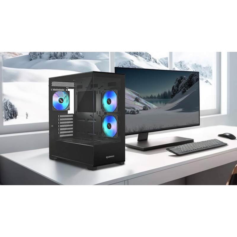 Raidmax Infinita Series Tempered Glass Aqua View Case - Corner Structure-Free Panoramic Design, ARGB Fans Included, and Support for 360mm Water Cooler and 400mm GPU (i801, Black)