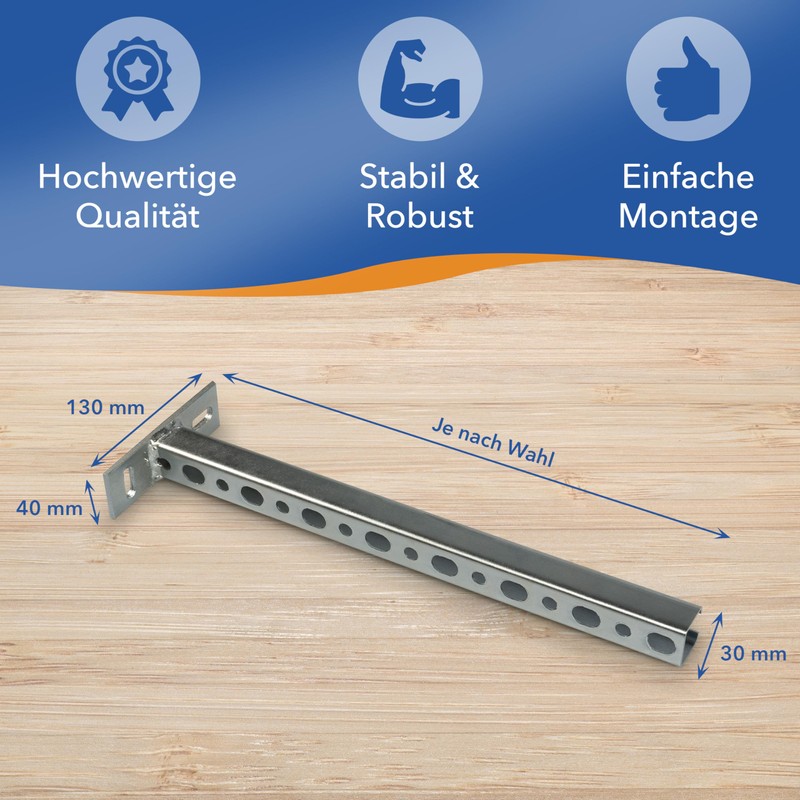 Technical data heavy duty bracket: length wall mounting: 130 mm, flat steel: 40 mm wide and 5 mm thick, bolt circle: 10 mm x 25 mm, material: galvanised steel.