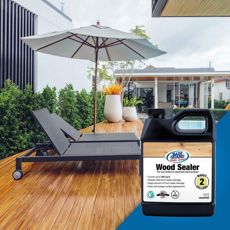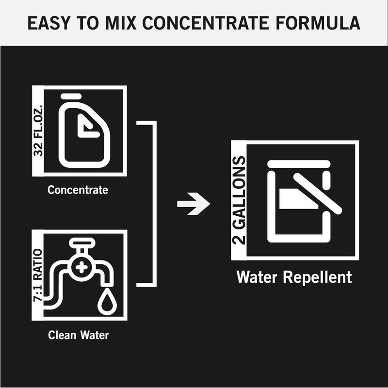 • CONCENTRATED FORMULATION: Cost-effective, concentrated sealing solutions! Rainguard Water Sealers Wood Sealer Concentrate offers the best value and simple mixing. Pour the quart of concentrate into a 5-gallon pail and add clean water to the 2-gallon mark. Mix lightly to disperse the material. Two gallons of this impregnating wood waterproofer coats, seals, and protects up to 400 square feet. Try Rainguard Water Sealers' ready-to-use formulations for ease and convenience.